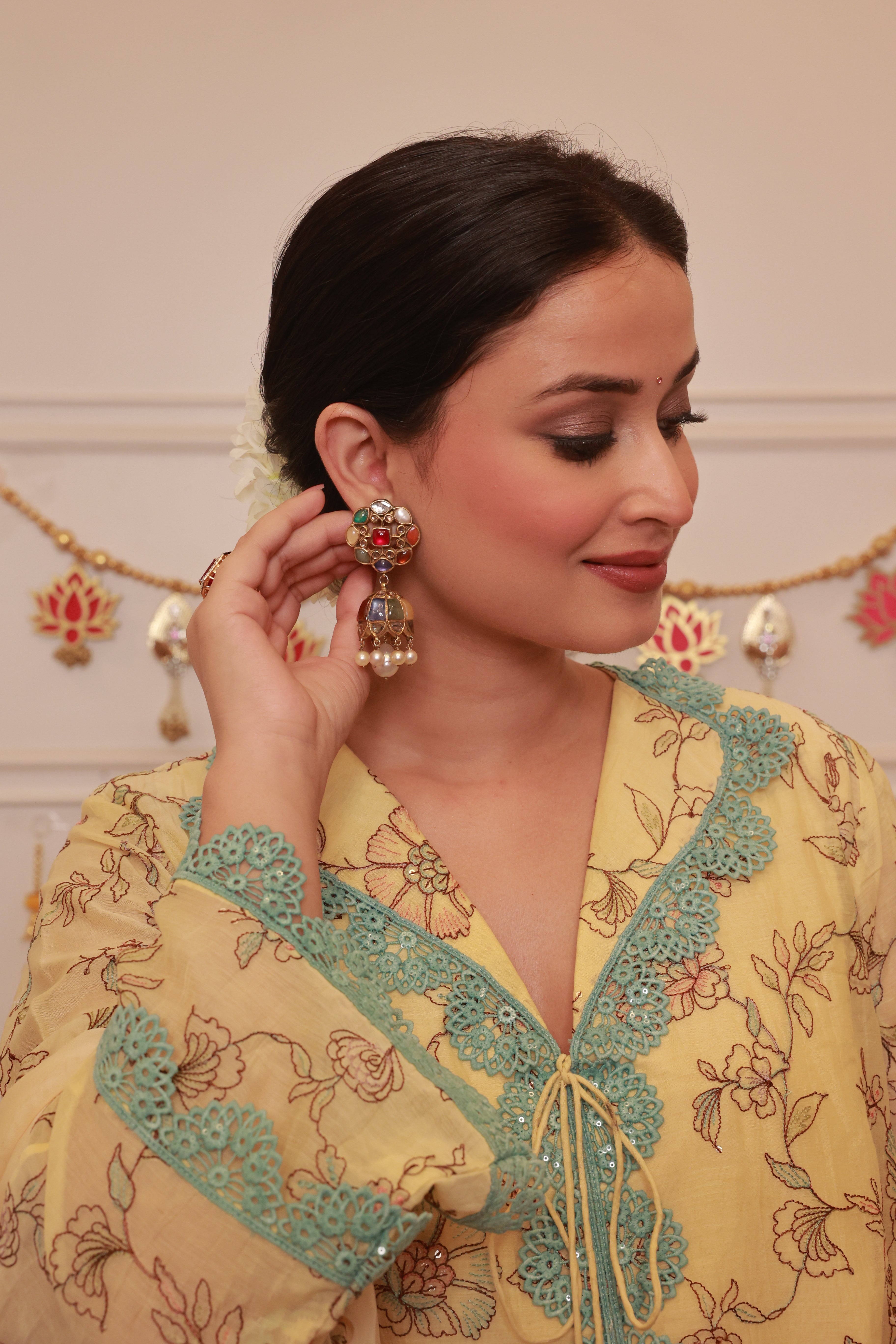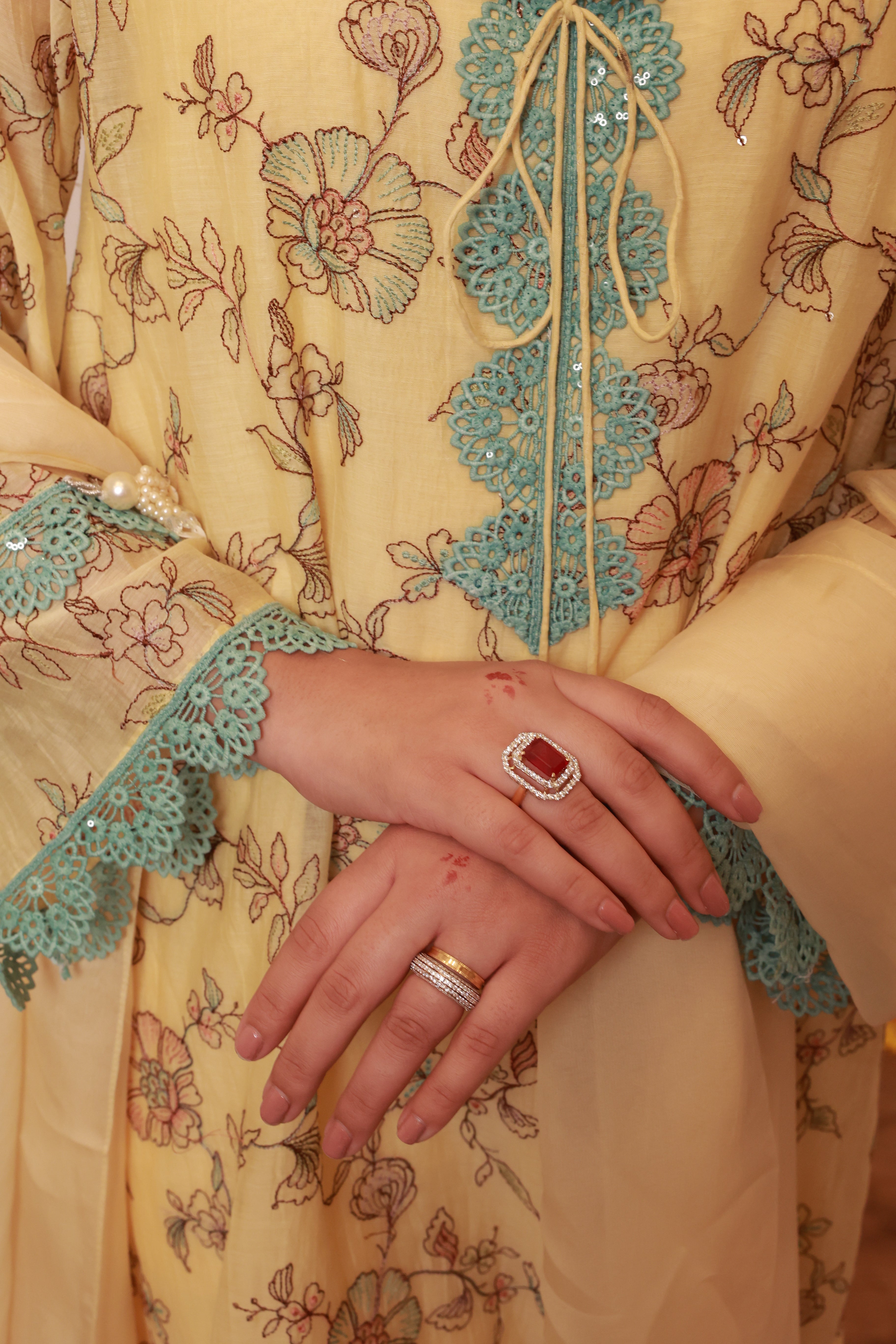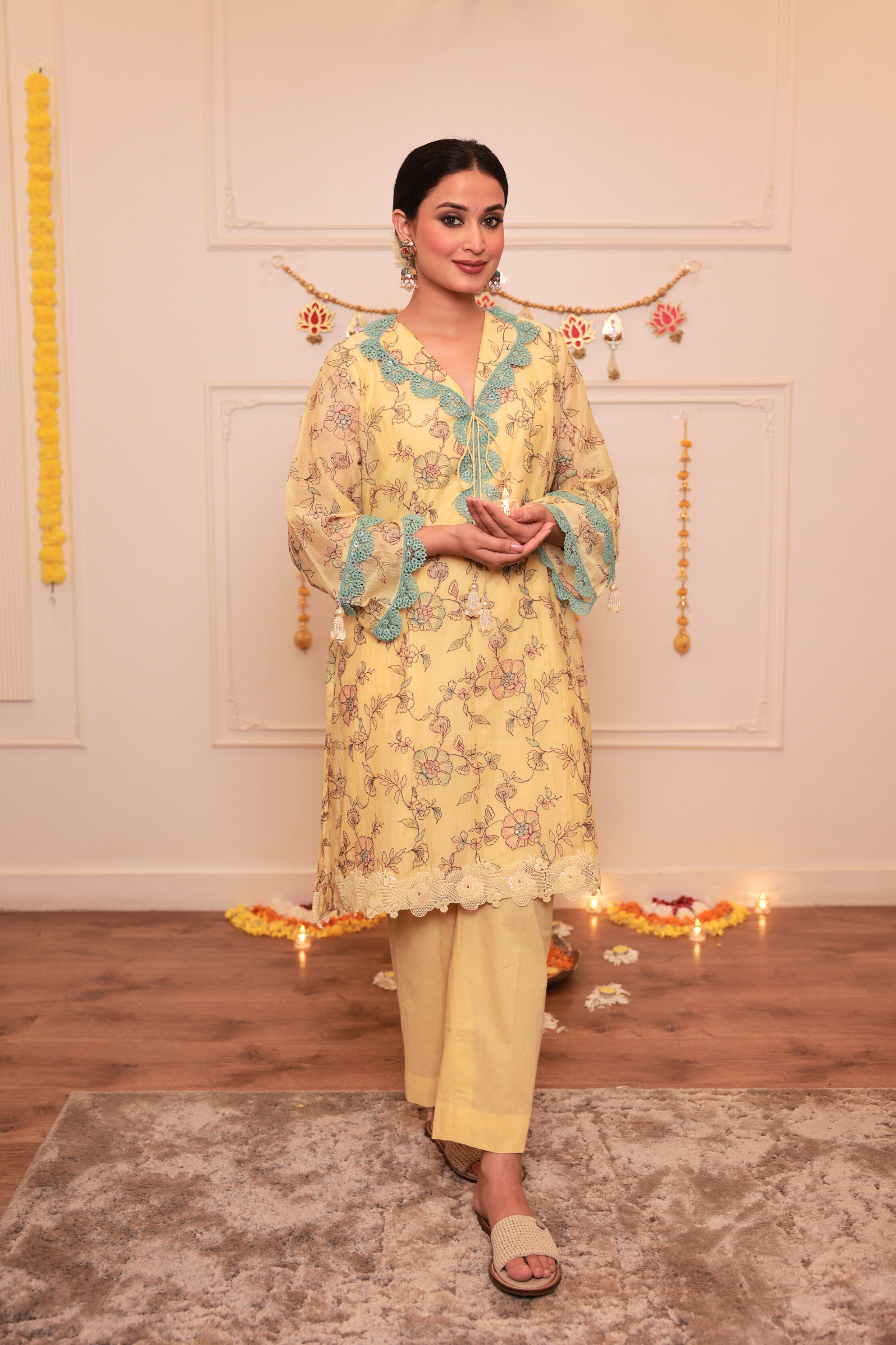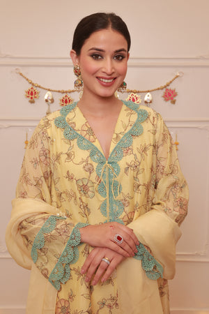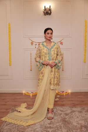 This set is a stunning celebration of bohemian style. Intricate thread work in warm, earthy tones is beautifully contrasted by collar detailing in a striking blue, creating a harmonious blend of light and dark. The coordinated pants and sheer dupatta complete the ensemble, making it effortless to wear while exuding charm and individuality. Perfect for gatherings or special occasions, this set is designed to make you stand out with subtle elegance and artistic flair.